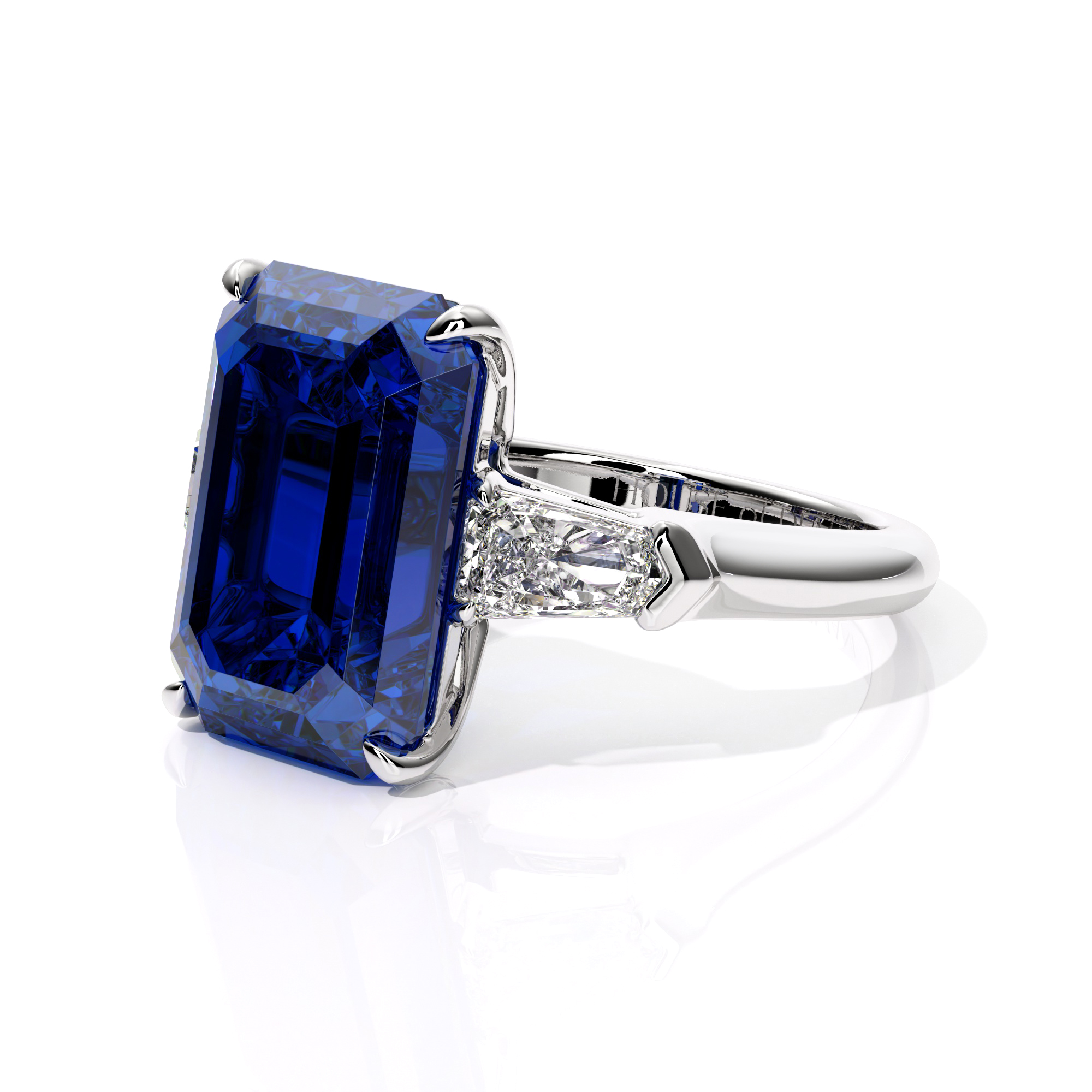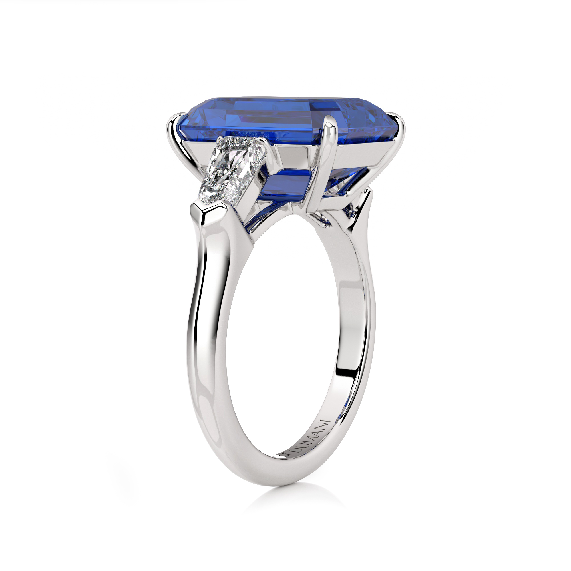 Featuring an 8.39-carat Royal Blue Madagascan sapphire, this ring is complemented by two identical tapered bullet-shaped diamonds. Set in platinum mounting, this piece is for those who appreciate bold colour and a classic design. The deep blue hue of the sapphire is eye-catching, which is enhanced by the brilliant diamonds to add a touch of sparkle. This ring will be a cherished addition to any collection.