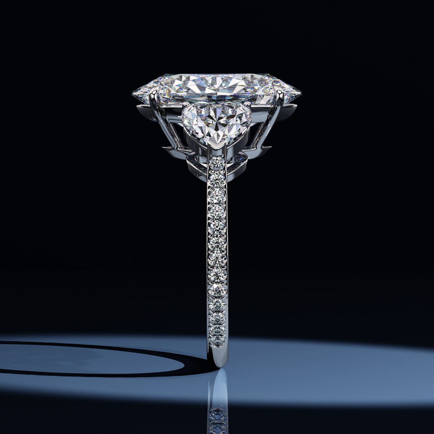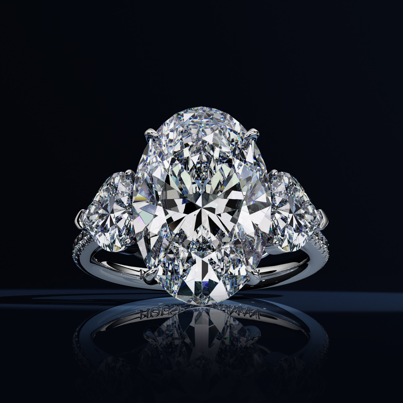 Showcasing a 7.63 carat E VS1 oval brilliant diamond, this ring exudes charm and distinction. The central diamond is flanked by two heart-shaped diamond shoulders and set in a platinum band adorned with pavé diamonds, totaling approximately 1.51 carats. Ideal for connoisseurs of fine jewellery. Each detail is meticulously crafted, so that this ring stands out as a true work of art.