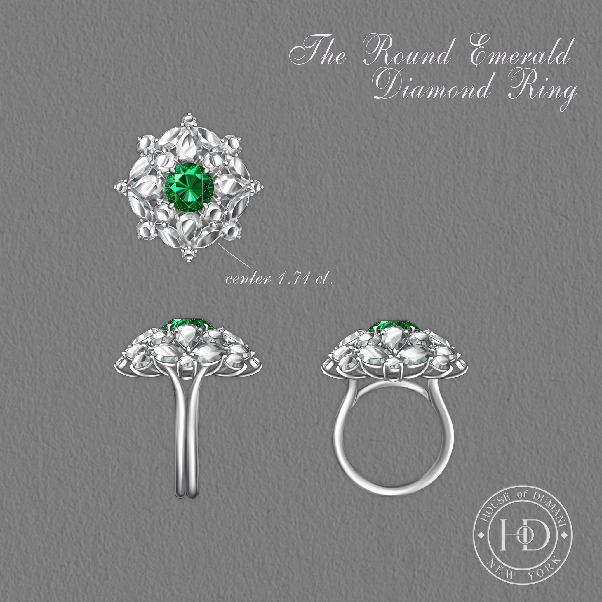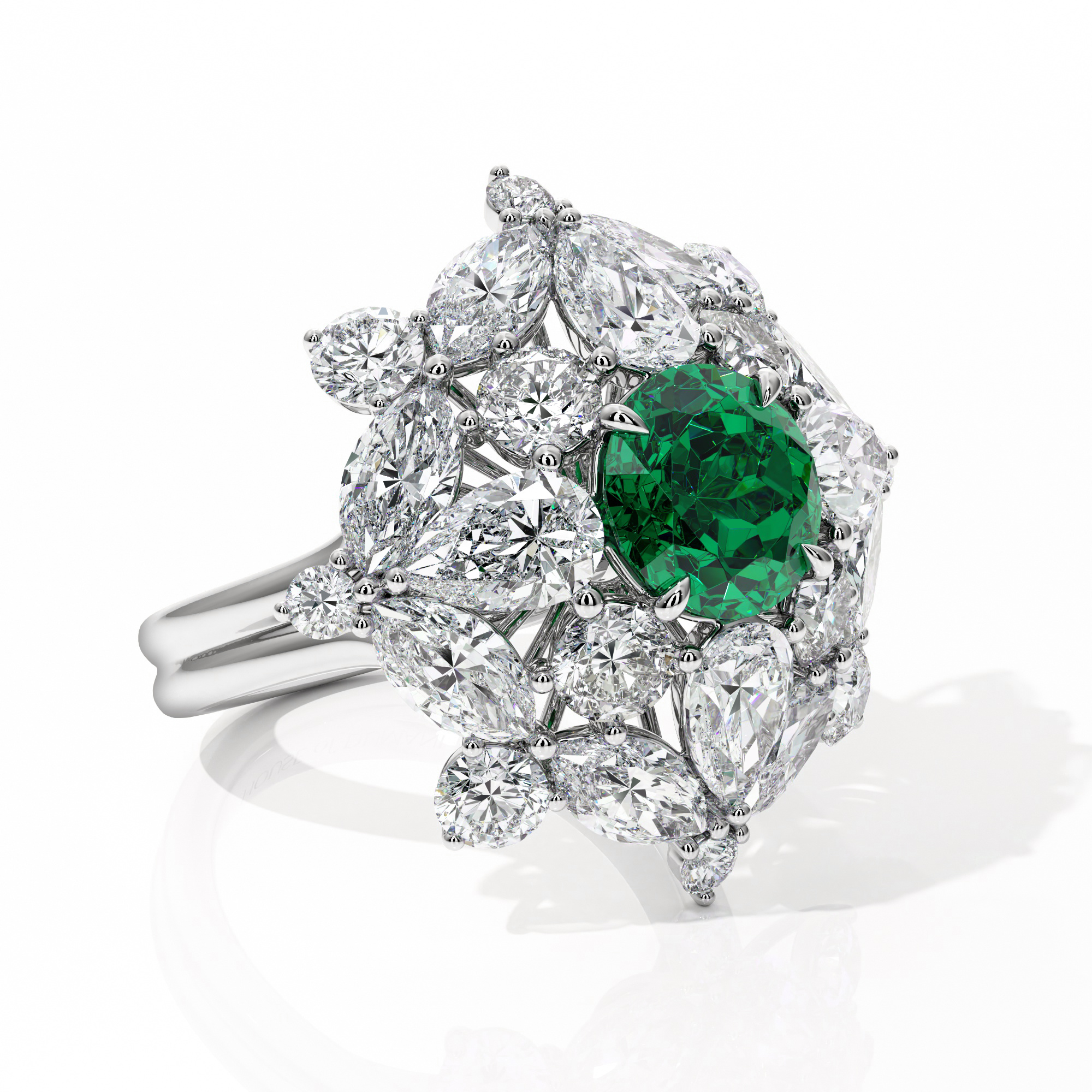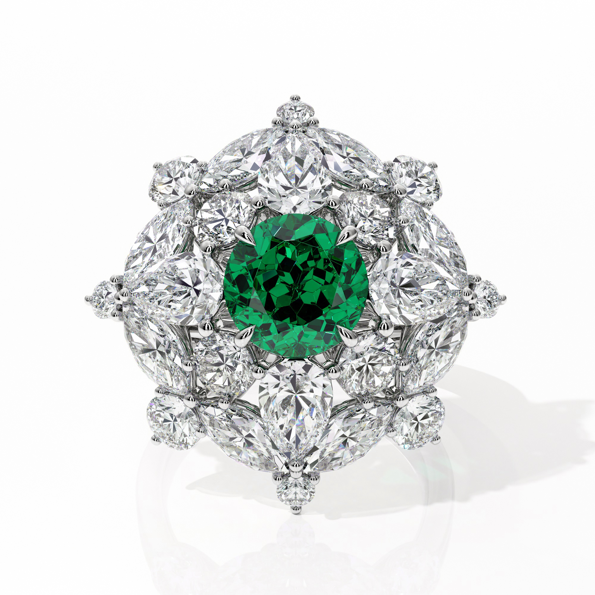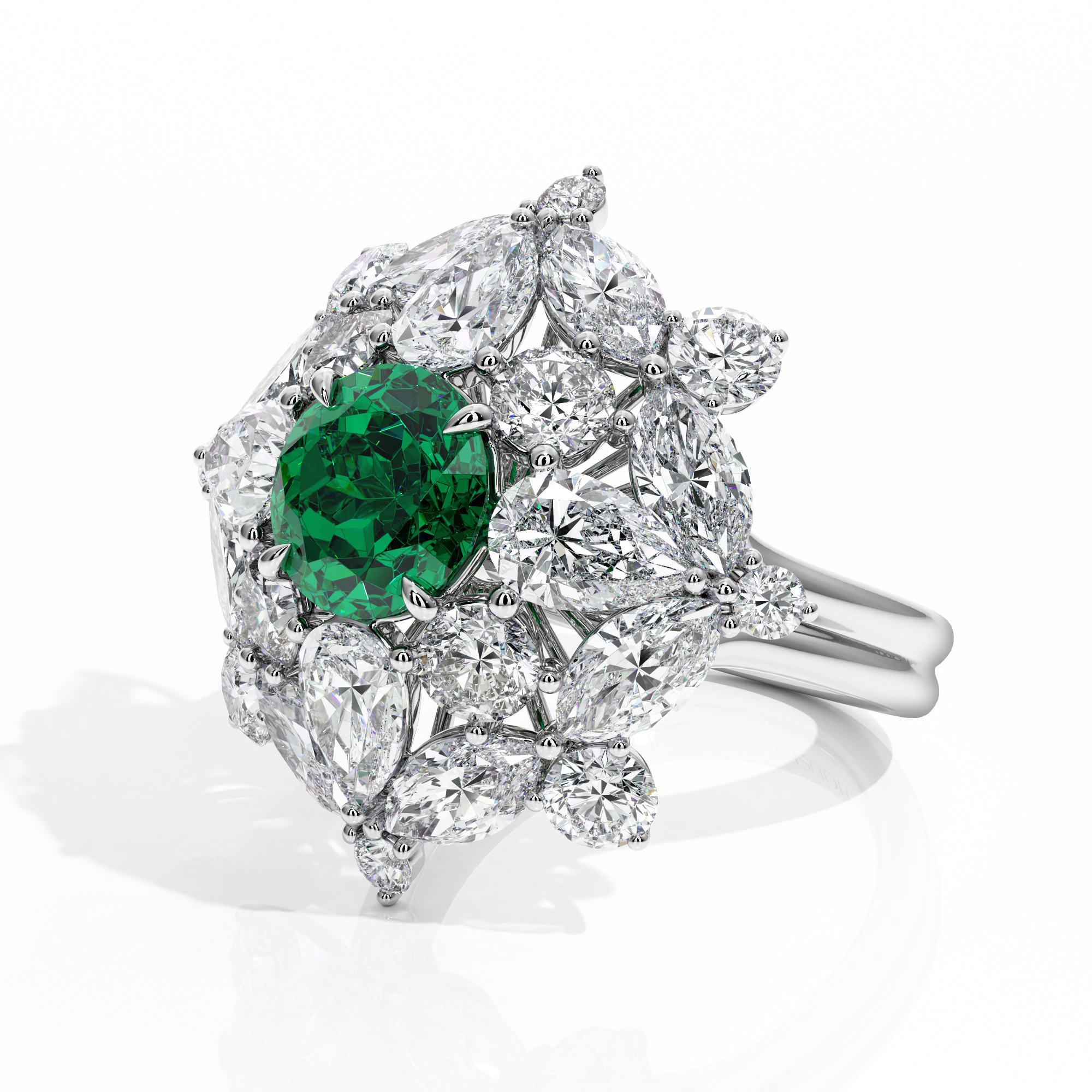This piece features a 1.71-carat round green emerald that is selected for its exceptional hue and clarity. The emerald is surrounded by white diamonds in various shapes and totals approximately 5.64 carats. Set in platinum, this ring is ideal for special occasions. The intricate arrangement of the diamonds brings out the emerald's dazzling colour to create an enchanting design. Ideal for those who appreciate unique, high-quality jewellery and is an excellent addition to any collection.