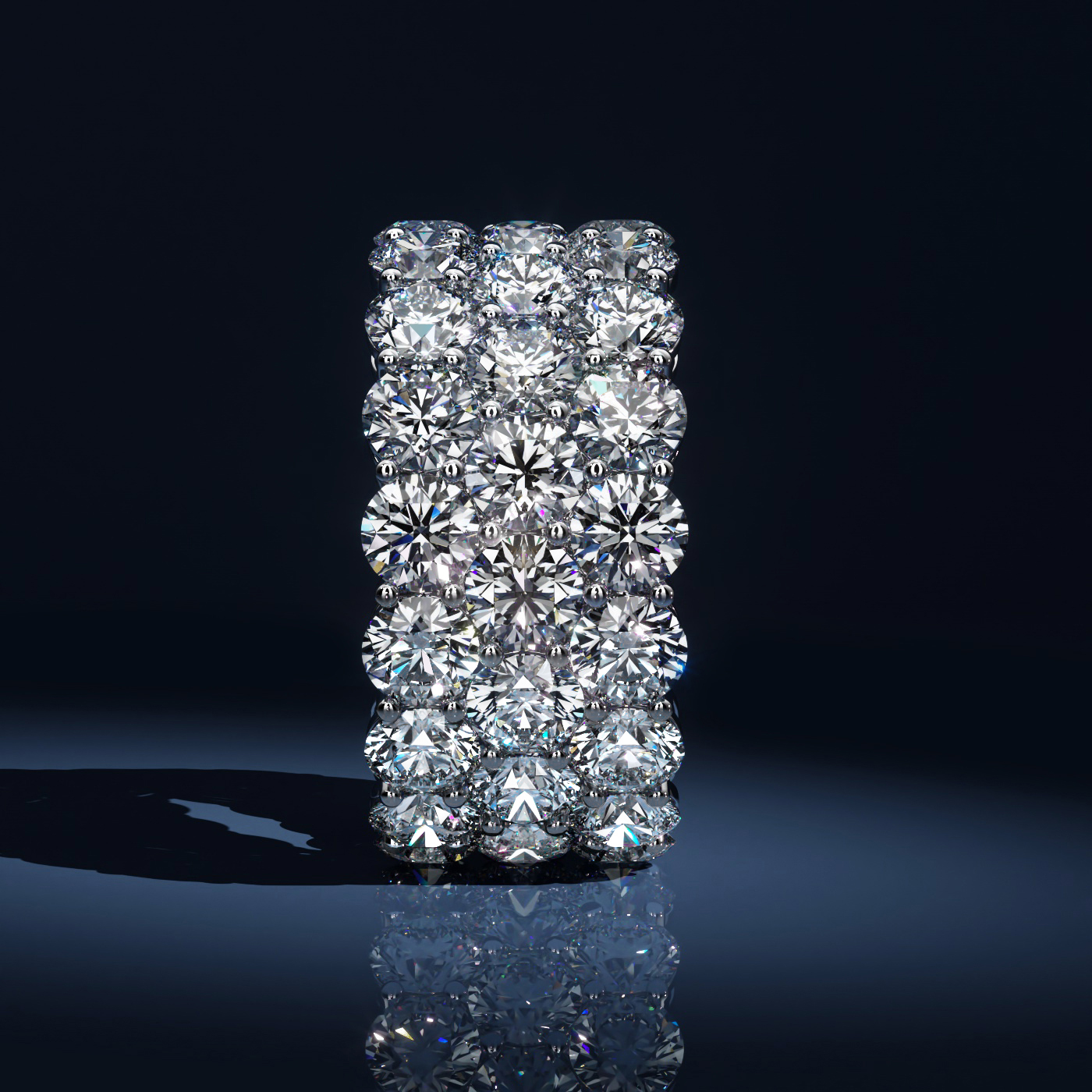This band, masterfully crafted in platinum, showcases three rows of shimmering round diamonds that encircle the finger in a brilliant embrace. Each diamond, weighing approximately 11.75 carats in total, is GIA-certified D-E colour and VVS clarity. Designed for those who appreciate the finer things in life.